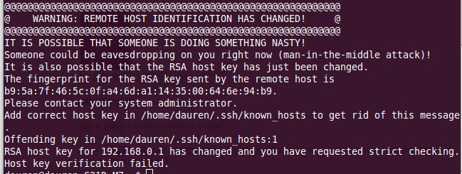 Спасибо помогло, просто очистил содержимое /home/dauren/.ssh/known hostsОбрати внимание на вот эти строчки: