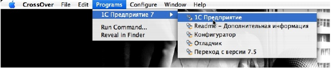 Шаг 17. Перейдя в меню CrossOver «Programs -> 1С Предприятие 7 -> 1С Предприятие»